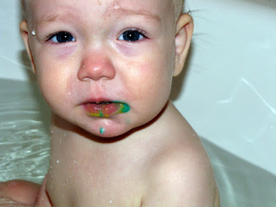 Laurelea and I have Hand/Mouth/Foot mouth virus, which is a real bummer for us both. Laurelea has some bumps in her mouth but overall seems to be on the mend. We have been spending a lot of time inside this week. The weather also has been crummy so we decided to make our own finger paint for the bath tub.